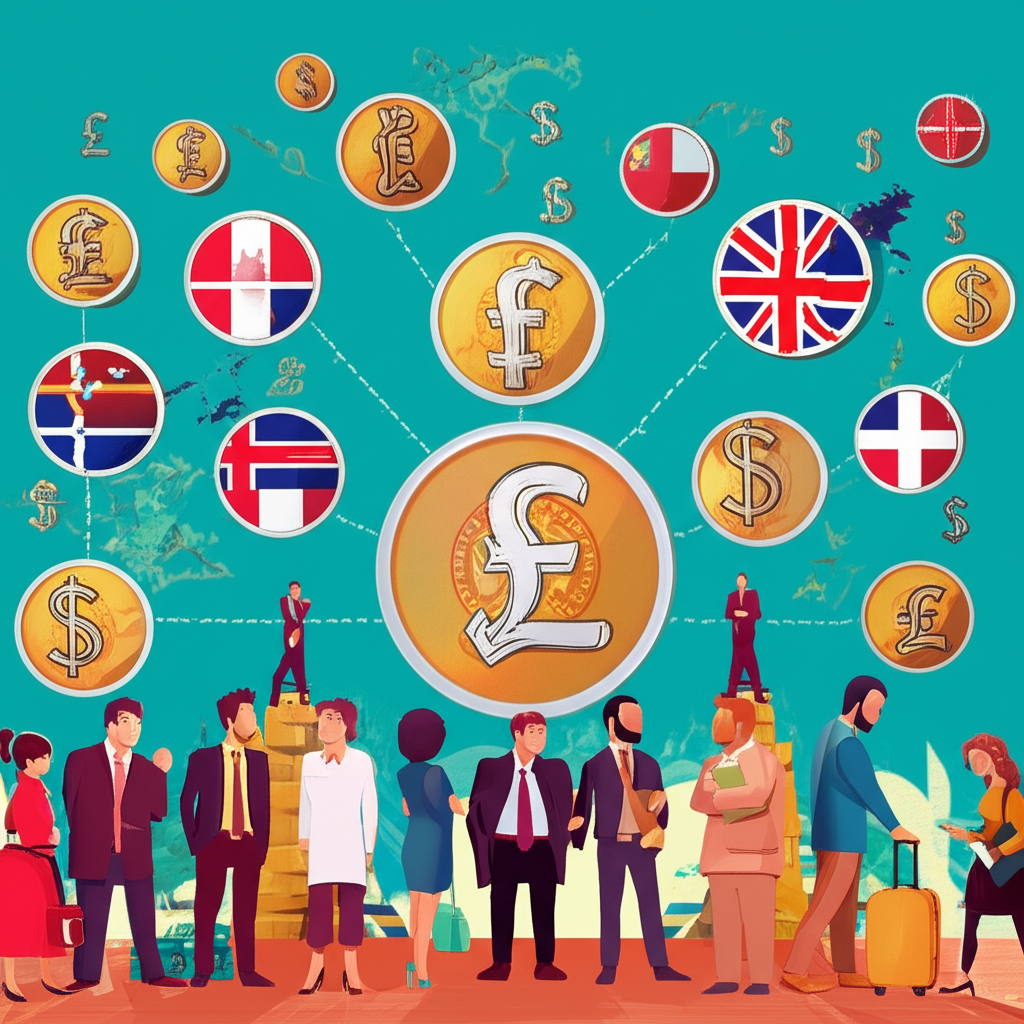 英鎊貨幣影響全球市場的插圖,顯示連接線條連結不同國家與金融符號,以及多元人群注視波動貨幣圖表
