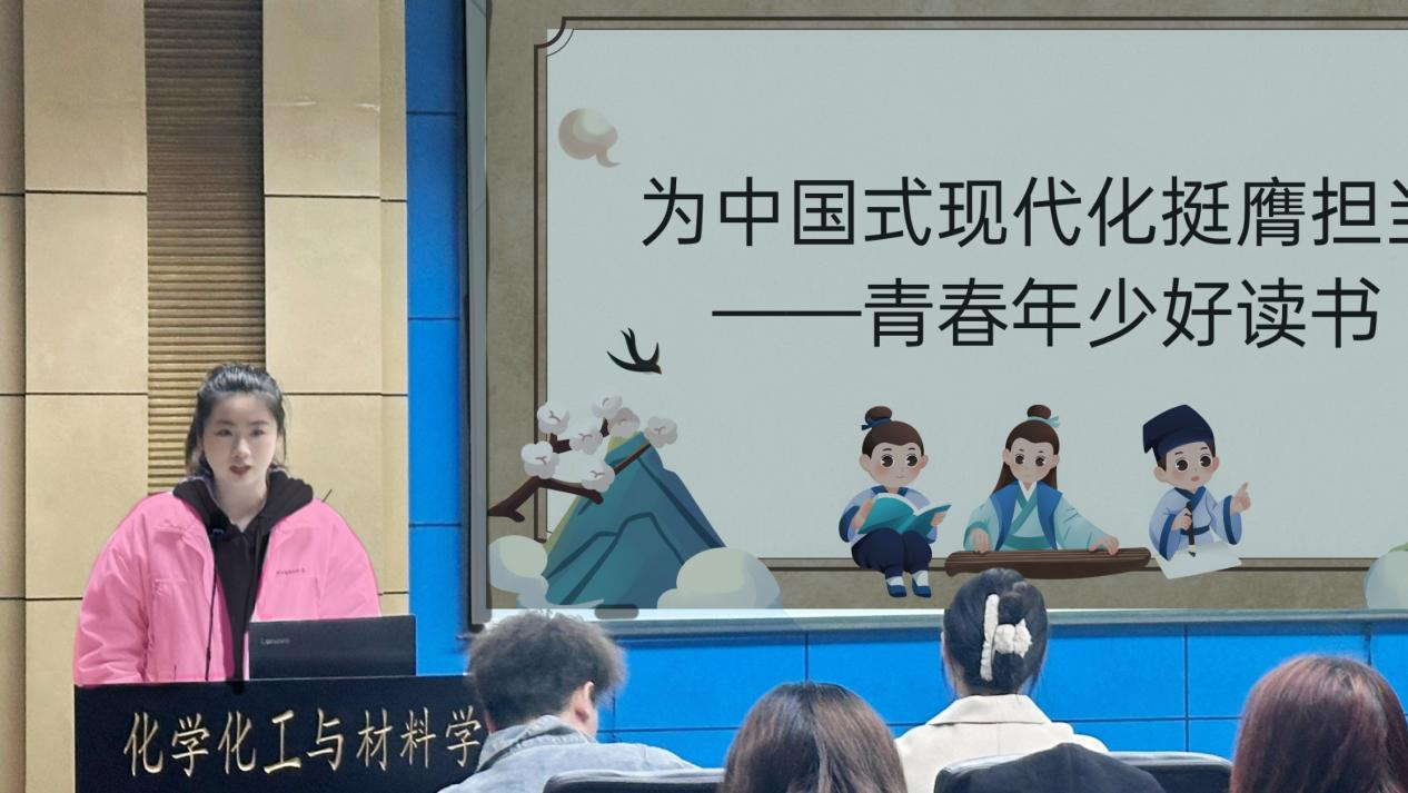 化学院员工会主席欧阳依美领读了《论党的青年工作》片段。她表示党的青年工作要坚持立德树人,全面贯彻党的教育方针,培养德智体美劳全面发展的社会主义建设者和接班人。并且她着重强调,党的青年工作要关注青年的全面发展,既要注重培养青年的政治觉悟和道德品质,也要关注青年的知识技能和身心健康,让青年在全面发展中为国家和民族作出更大的贡献。