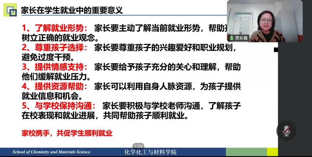 会议尾声,贾彩鑫老师作总结讲话,并对下一阶段就业升学工作作出部署安排。她强调,要坚持升学规划与就业指导双轮驱动、协同并进,系统梳理当前就业工作核心痛点,以毕业生专业特点和个性化需求为出发点,落细落实精准化、差异化就业指导服务。同时,她倡议家校双方深化协同联动,凝聚育人合力,构建家校院三位一体的就业支持体系,为2026届本科毕业生高质量就业、高水平升学保驾护航,为学院就业工作提质增效指明清晰方向。