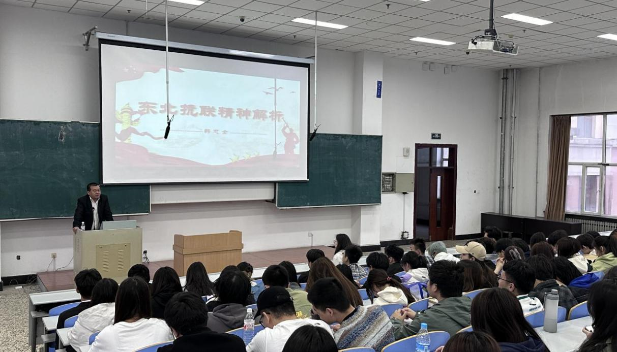 韩忠全以《东北抗联精神解析》为题,从东北抗联精神的形成演进、内涵要旨及其价值表征三个部分着手,号召同学们学习东北抗联精神蕴含的爱国、担当、奋斗、团结诸多优秀精神品质,新时代青年是强国复兴的接力者和建功人,赓续东北抗联精神在内的民族精神和革命精神,争当东北抗联精神的传承者、弘扬者和践行者,担负强国复兴使命,争做强国复兴先锋。
