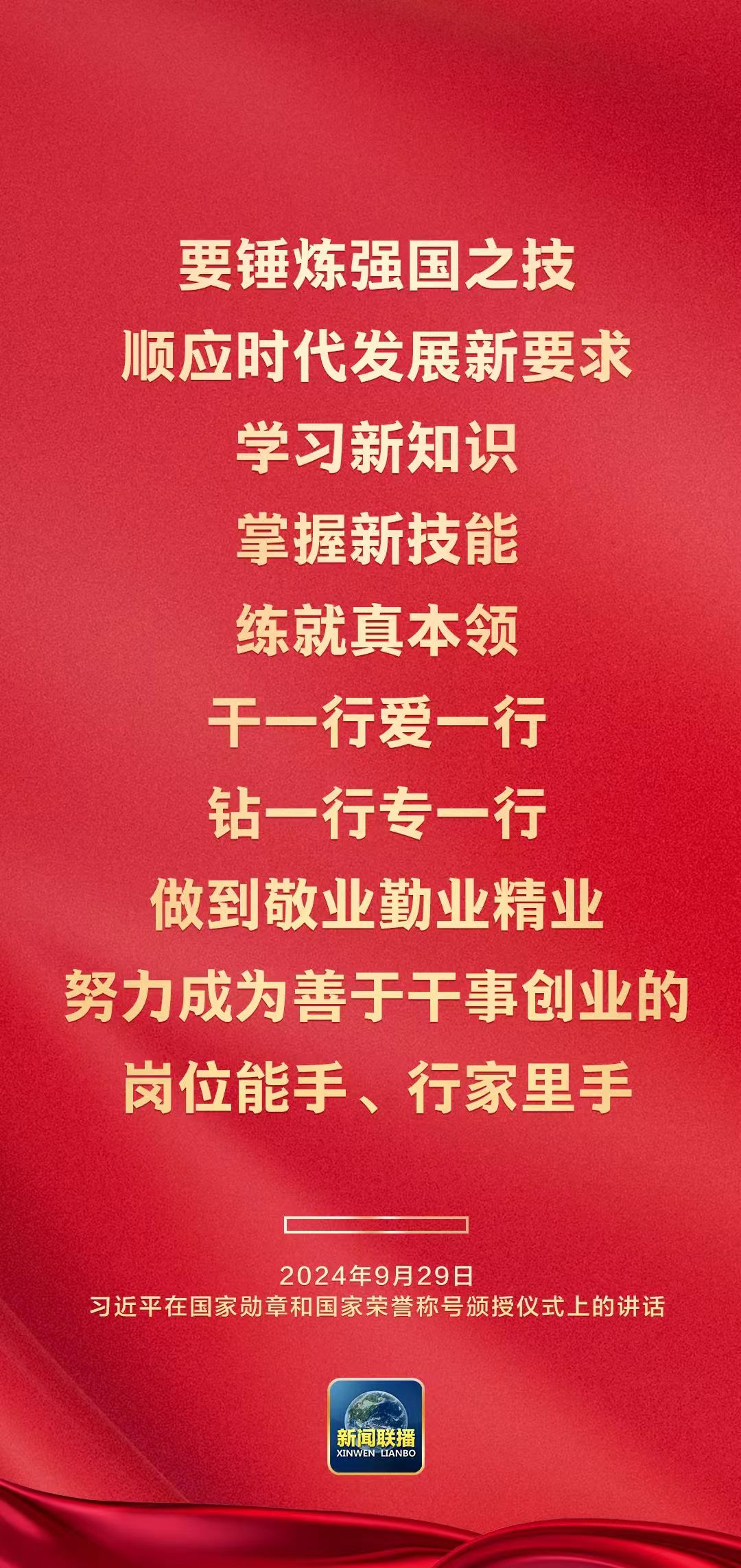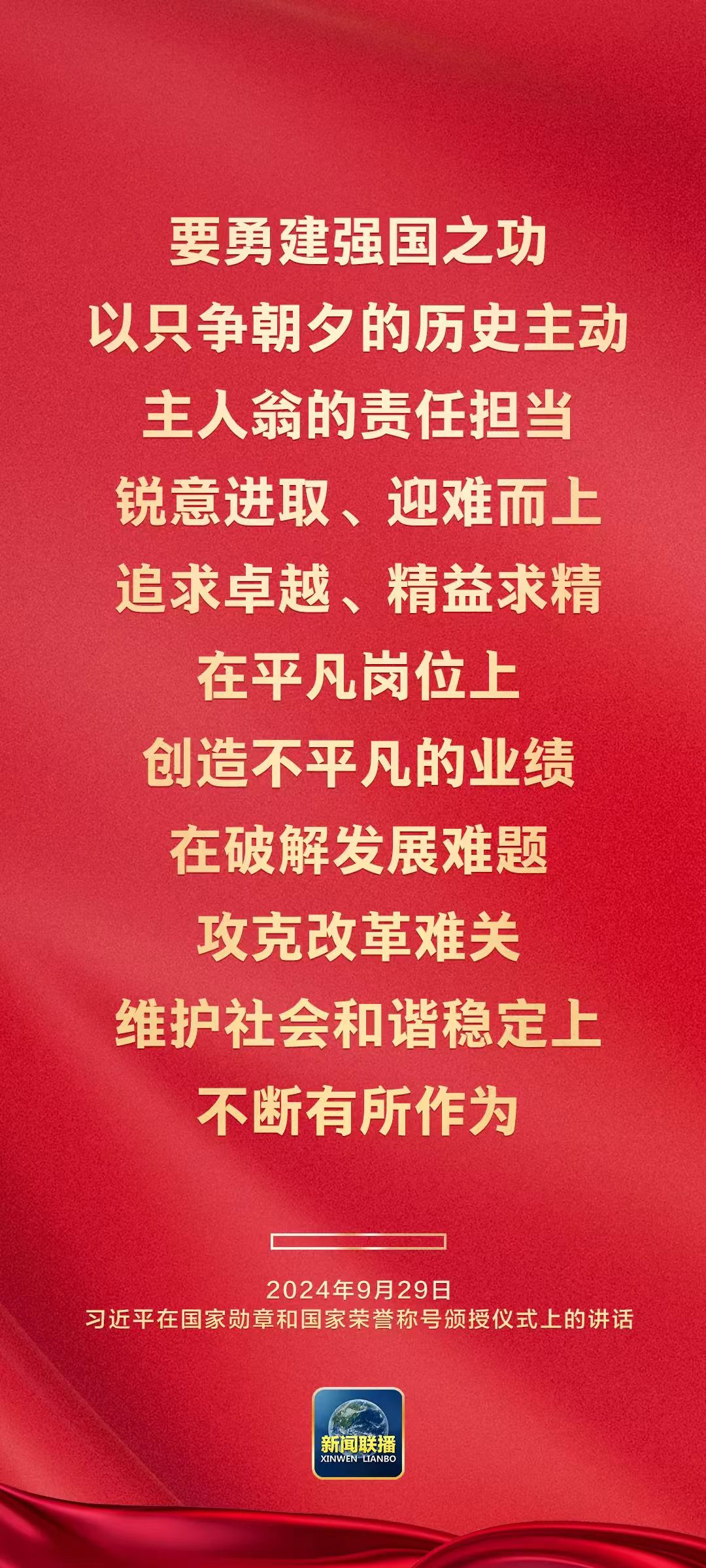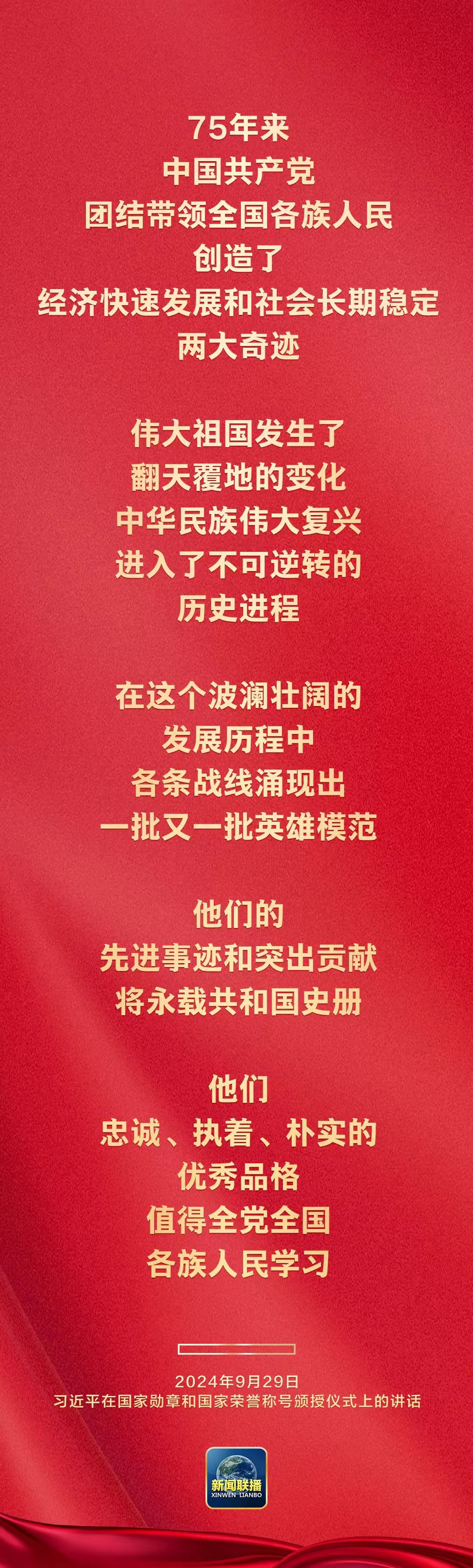9月29日上午,中华人民共和国国家勋章和国家荣誉称号颁授仪式在人民大会堂隆重举行。中共中央总书记、国家主席、中央军委主席习近平在国家勋章和国家荣誉称号颁授仪式上发表重要讲话。