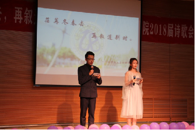 诗歌会伊始,即将离开校园的2018届毕业生用他们最动人的嗓音,向我们诉说着四年老员工活的苦辣酸甜。吉他弹唱,乐队电音,毕业生们用多姿多彩的方式,为我们演绎一首首耳熟能详的曲目。一阵阵高亢的歌声,引起在场观众心中的共鸣,并赢得了阵阵喝彩;优雅的诗朗诵,让每个人都沉醉神往,让每个人都相遇在那个绽放的青春年华。