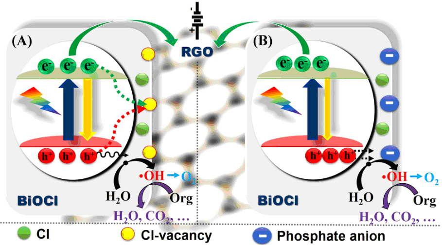 Scheme proposed mechanism for the photogenerated charge transfer and separation in RGO/BOC photoanodes before (A) and after phosphate modification (B).