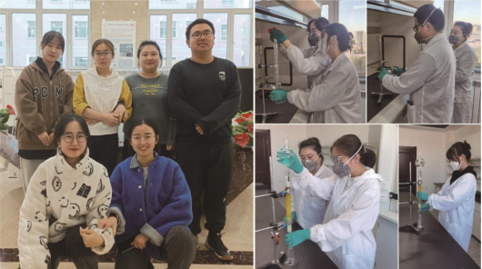 团队成员合影(从左到右,第一排:王欣然、李丽媛;第二排:苏梦雪、钟春雷、孙佳南、倪骥腾)及团队成员正在进行反应准备和摸索产物提纯条件