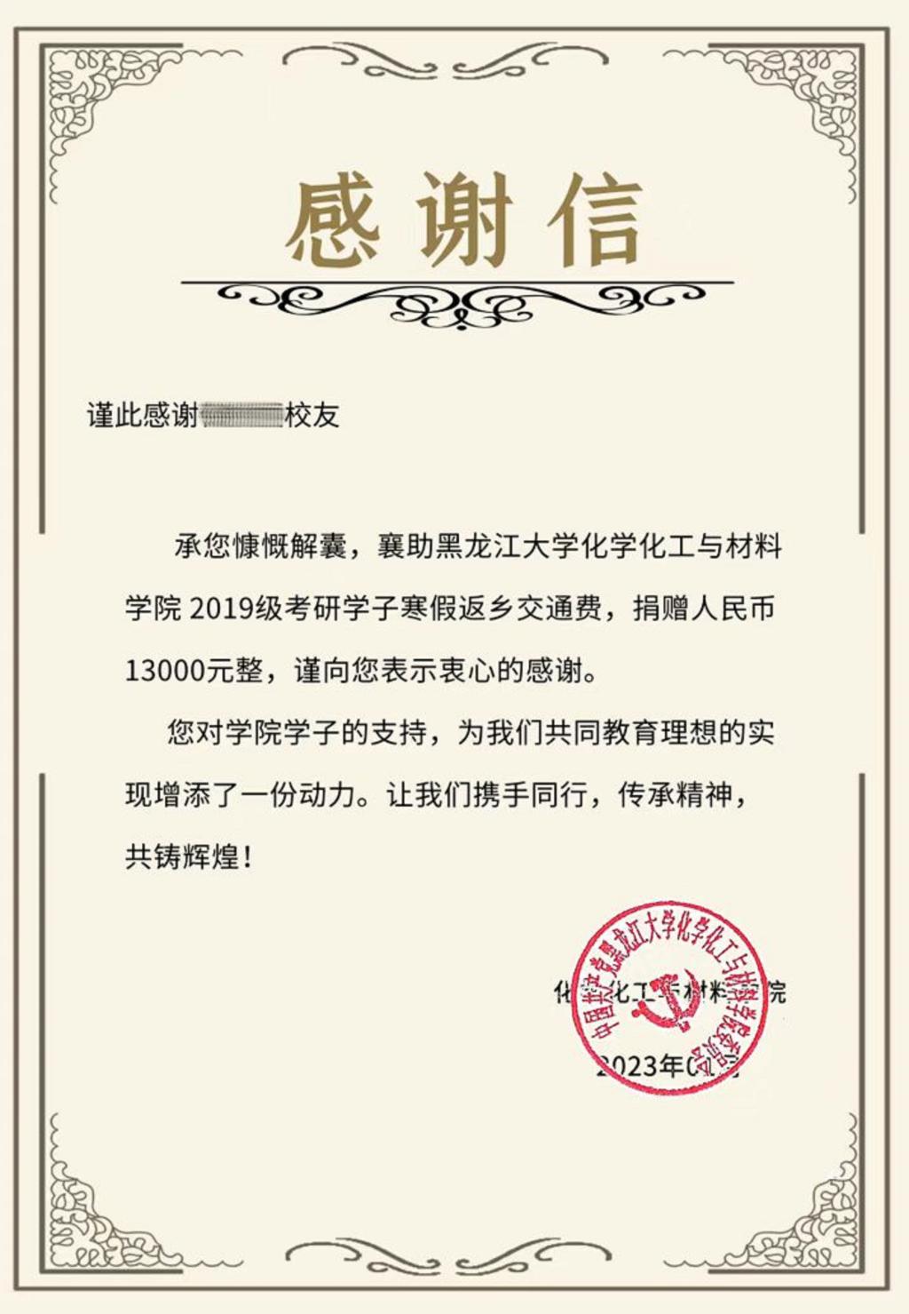 该员工表示,在校时,学校和学院是员工的坚强后盾;毕业后,学校和学院仍是员工牵挂的港湾。在疫情防控常态化背景下,为保证黑大学子能够平安踏上返乡路程,母校安排大巴车闭环送往机场、车站,为员工提供“包机”、“包车”服务,展示出了属于黑大的精神风貌;母院全方位全覆盖为考研学子送温暖送祝福,考研指导、经验交流、心理疏导、温暖送考等服务,多措并举为考研学子保驾护航。自己感受到学校和学院用心、用爱、用责任感肩负起员工培养的责任,回想自己当年读书时也得到了学校、学院的许多帮助,感怀学院栽培之恩,希望能尽自己的一份心意,为学院做一些力所能及的事情。