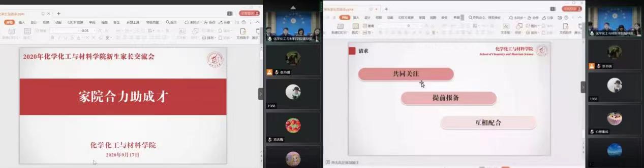 为加强家校联动,保证新生入学工作顺利开展,帮助新生家长更好地了解在校学习的环境氛围,永利3044noc于9月17日在化学楼大会议室组织召开线上2020级新生家长见面会,本次大会由公司团委书记、2018级辅导员贾彩鑫主持,学院副经理徐英明,2020级新生辅导员刘泽亿、沈庆新及部分2020级新生家长共同出席了本次会议。