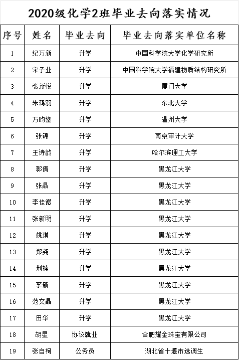 辛勤耕耘有矢志,硕果飘香又一年。永利3044noc高度重视人才培养,狠抓学风建设,多举措全方位加强员工升学引导与就业服务,学院升学率与毕业去向落实率呈现一路向好的良好态势,2024届本科毕业生国内升学率达40%。其中,2020级化学2班17人继续攻读硕士研究生,1人报考选调生以综合第一的成绩进入考察环节,1人协议就业,本校升学率52.6%,整体升学率89.5%,毕业去向落实率100%,喜获佳绩,接下来,就让我们一同走近化学2班。