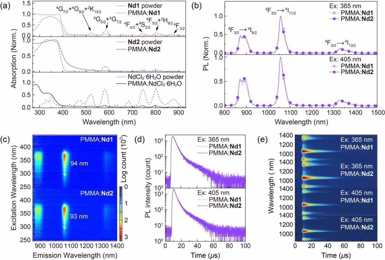 Nd1和Nd2薄膜在270-420 nm处表现出较宽的吸收带,这些由配体产生的紫外和深蓝色吸收带为LED泵浦奠定了基础。在365 nm和405 nm激发下,Nd1和Nd2的薄膜的光致发光行为反映了配体向Nd3+离子的高效能量传递。