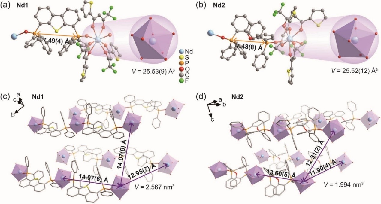 通过单晶X射线衍射分析确定了一维链Nd1和Nd2表现出规则的取向和有序的包装模式。然而,Nd2在三维空间中表现出更短的Nd-Nd间距和无π-π堆积,这使得Nd2具有Nd3+离子更局部密集的激发能量积累和浓度猝灭抑制的优势,使其更适合于高性能和小截面波导放大器。