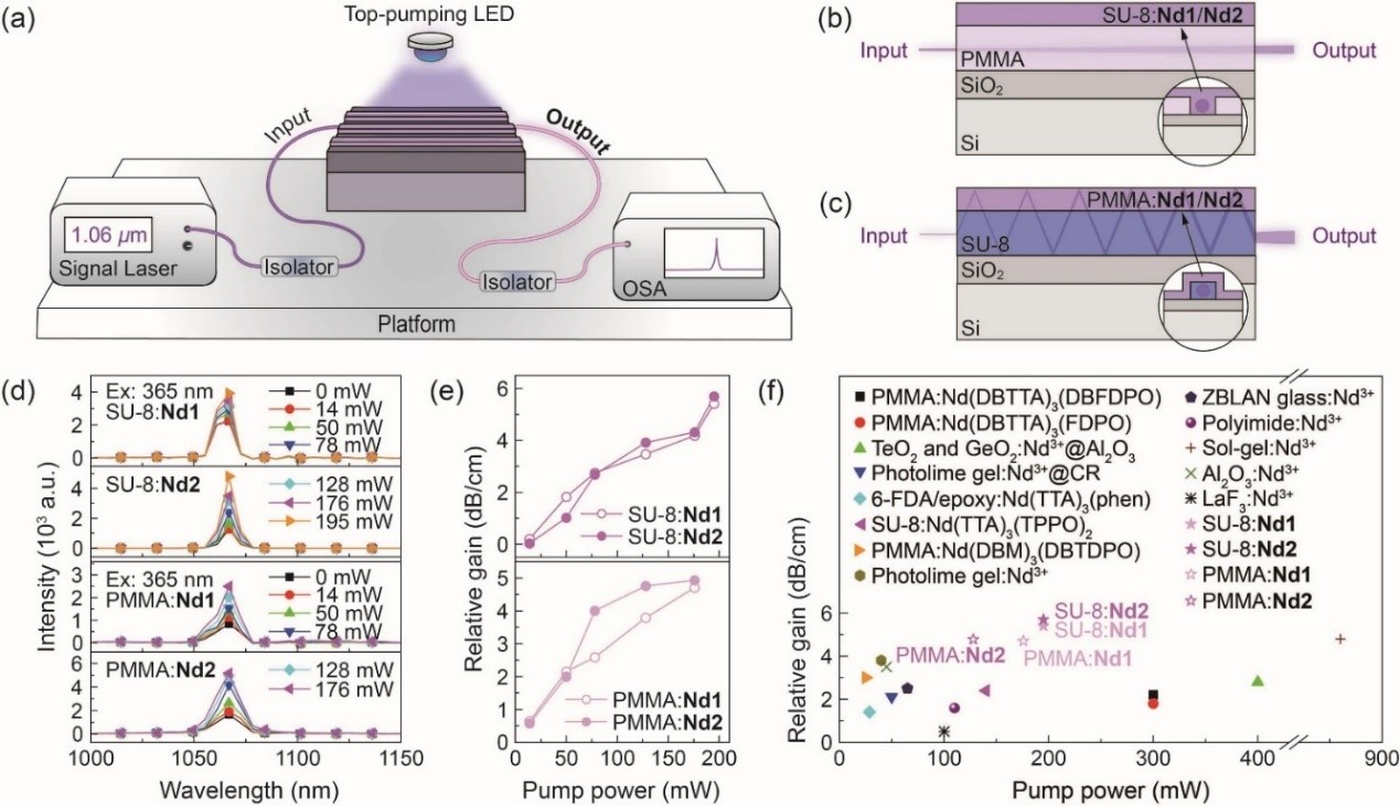 通过垂直顶泵浦模式,采用传统的嵌入式和新型的倏逝场波导结构,掺Nd1波导器件在1.06 µm处的最大相对增益分别为5.4和4.7 dB/cm,值得一提的是,掺Nd2波导器件在1.06 µm处的光学增益性能(最大值为5.7和4.9 dB/cm)超过了大多数无机NDWAs,特别是基于单核Nd3+配合物的NDWAs的< 4.0 dB/cm的最大值。