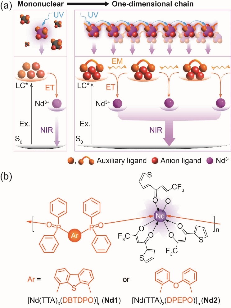 图1 用于光学放大的Nd3+配合物的设计策略和两种一维配位链的化学结构。