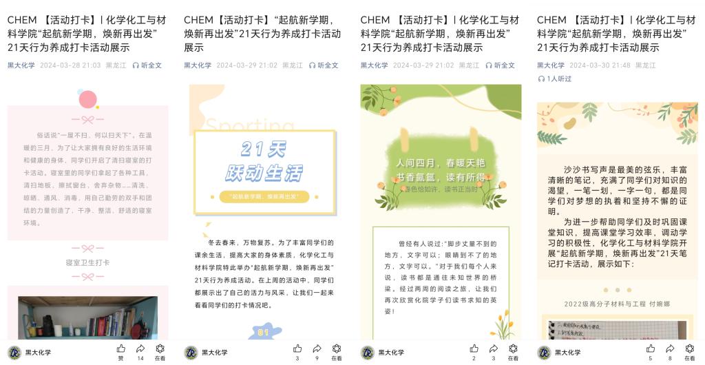 4月初,学院员工会学习部组织开展二十一天打卡活动,突出以员工自我管理为主,提升员工自主意识,帮助员工养成良好的学习习惯,提高员工综合素质。5月初,学院员工会与其他5个学院联合举办“博观约取,‘记’厚流光”课堂笔记大赛,提高同学们的课堂效率与学习主动性,营造和谐上进的学习氛围。在四六级考前,通过学院官方公众号平台推出四六级知识系列推送4期,线下邀请高分过级优秀员工开展四六级经验交流会,帮助员工明晰做题思路,提高学习效率和四六级过级率。