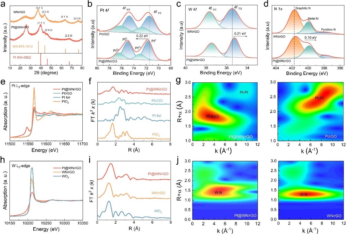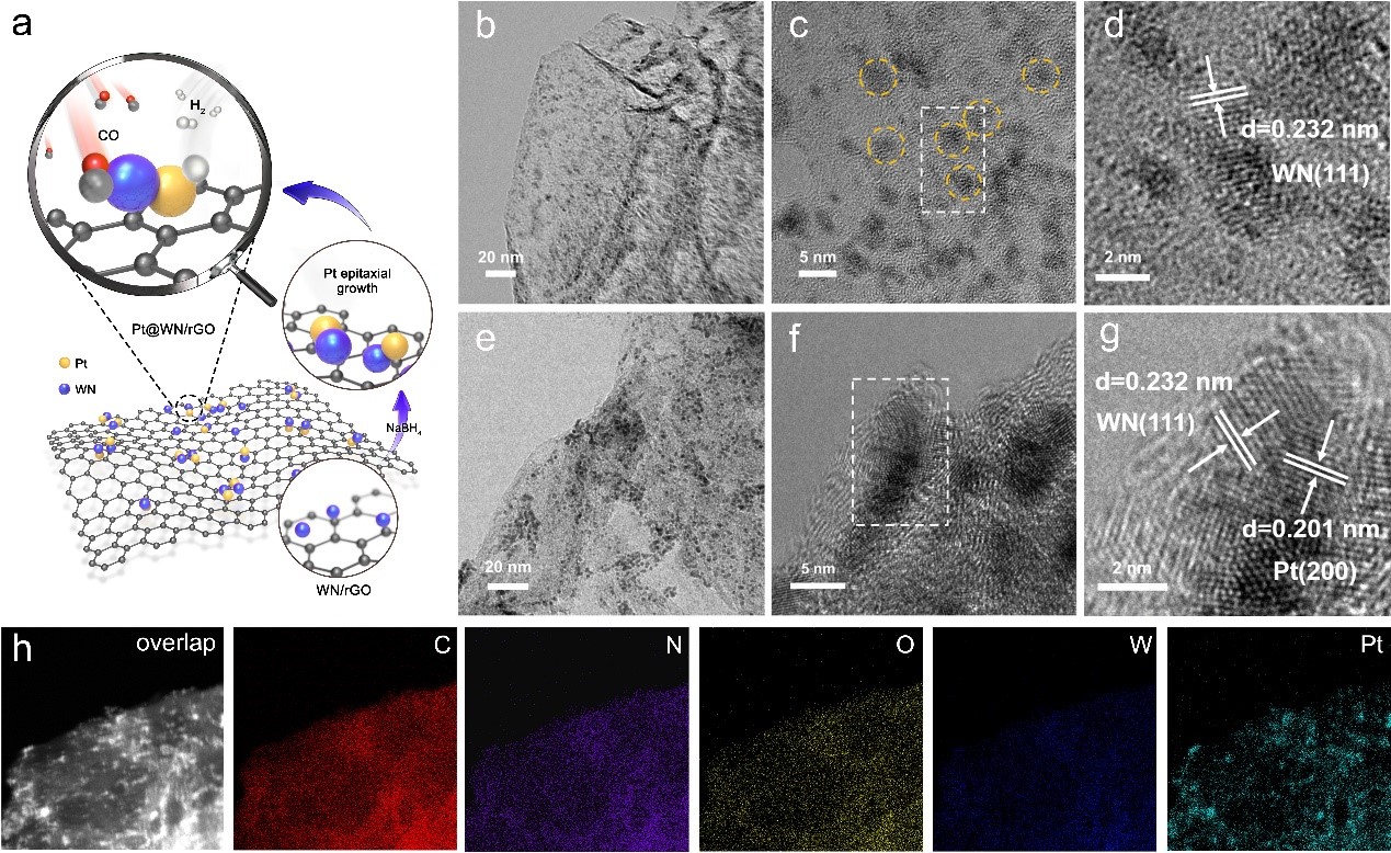 质子交换膜燃料电池(PEMFCs)可直接将高能量密度的氢燃料转化为电能。然而,对高负载Pt基电催化剂的依赖增加了PEMFC的成本,阻碍了其广泛的商业应用。虽然天然气重整制备的“灰氢”是主要的、经济可行的氢气来源,但是不可避免含有CO杂质会导致Pt被毒化,即使在ppm级CO浓度下毒化现象也较为明显,急剧降低了其HOR催化活性。因此,迫切需要探索具有高HOR活性和抗CO毒化的低Pt电催化剂。过渡金属间隙化合物(TMICs)表现出类铂的特性,具有丰富的表面活性位点和显著的化学稳定性,可以作为助催化剂提高反应速率和选择性。氮化钨(WN)在Fischer-Tropsch合成过程中表现出对CO的高选择性,也表明它在抗CO毒化方面具有重要潜力。鉴于此,我们首先在理论上预测WN能够改善CO的吸附和氧化,使Pt保持更多活性位点用于HOR。随后,设计合成了1.4 wt% Pt 纳米粒子负载的WN/rGO异质结(Pt@WN/rGO)。原位及离线表征证明WN能够调节Pt的电子结构,并优化CO的吸附及其后续的氧化过程。这提高了用于HOR活性位点的可用性,并显著增强了Pt的抗CO毒化能力。这种催化剂具有较高的酸性HOR活性,同时组装PEMFC也展现出了高性能和优异的抗CO毒化能力。