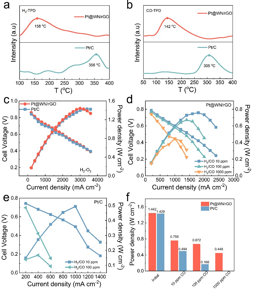 程序升温解吸(TPD)进一步用于监测H2和CO在不同催化剂上的结合能(图6)。Pt@WN/rGO异质结预吸附的H2和CO解吸温度远低于Pt/C催化剂,表明HBE和CO吸附能力被削弱。这说明Pt@WN/rGO异质结的HOR动力学更快,同时较弱的CO吸附强度更有利于CO的活化,使其更容易从Pt@WN/rGO异质结表面脱除,并增强了催化剂在 HOR 过程中对CO毒化的抵抗力。此外,PEMFC单电池测试中,在 H2-O2工作条件下,最大功率密度可达1.442 W cm−2,优于商业Pt/C(1.429 W cm−2)。即使在CO含量为10~1000 ppm的H2/CO混合物中,组装的PEMFC也能够在一定程度上耐受CO毒化。