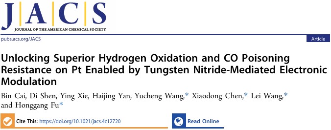 提高用于阳极氢氧化反应(HOR)的Pt基催化剂的活性和抗CO毒化能力是质子交换膜燃料电池(PEMFC)发展的关键挑战。近日,来自yl6809永利官网的付宏刚教授、王蕾研究员,南洋理工大学的陈晓东教授和厦门大学的王宇成副教授在Journal of the American Chemical Society期刊上发表题为“Unlocking Superior Hydrogen Oxidation and CO Poisoning Resistance on Pt Enabled by Tungsten Nitride-Mediated Electronic Modulation”的文章。通过理论计算预测,氮化钨(WN)能够精细调控Pt的电子结构,优化氢吸附,从而显著提升HOR活性;同时能够削弱CO的吸附,提高抗CO毒化能力。基于此设计合成了低含量Pt(仅1.4 wt%)负载在小尺寸WN/还原氧化石墨烯(Pt@WN/rGO)上催化剂。在酸性电解液中,该催化剂的HOR质量活性高达 3060 A gPt−1,并且在测试20小时后仍能保持98.1%的催化活性。尤为重要的是,在高浓度1000 ppm CO存在的情况下,HOR活性可以保持在98.2%以上,展现出优异的抗毒化能力。原位同步辐射分析表明,WN在电化学反应过程中调节了Pt的电子态,优化了氢吸附/解吸的动力学过程。与Pt/rGO相比,Pt@WN/rGO上的CO溶出峰电位更低,表明WN的引入减少了CO的竞争吸附,增强了Pt上氢吸附位点的有效性。这种协同作用显著提升了抗CO毒化能力以及HOR活性。作为阳极催化剂组装的PEMFC,在纯H2中具有1.442 W cm−2的高功率密度,同时在含有10~1000 ppm CO的H2/CO混合物中也表现出显著的耐受性。