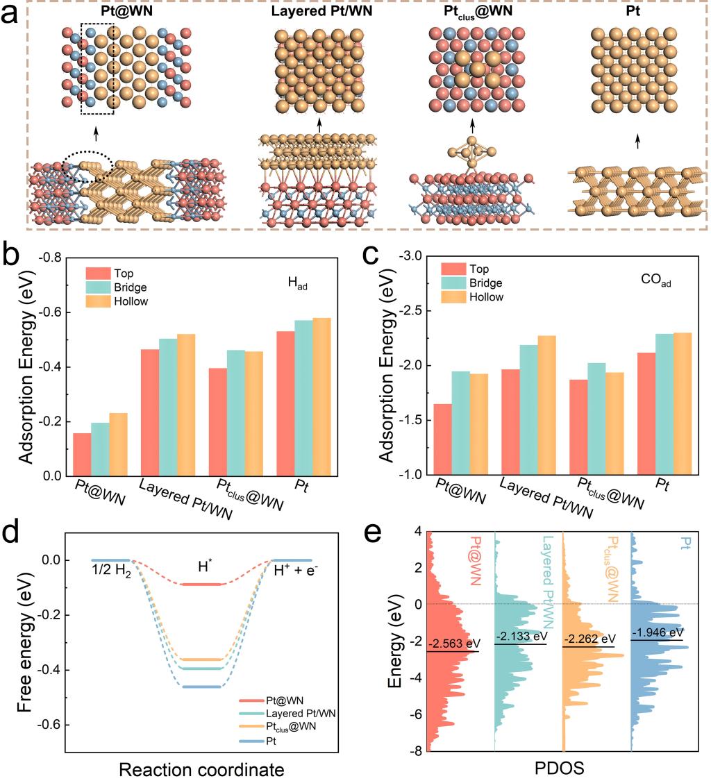 深入了解H2和CO在Pt表面的吸附行为,对于HOR活性提高及Pt基催化剂的抗CO毒化能力的条件是非常重要的(图1)。依据Pt和WN通常暴露的晶面,我们选择WN(111)和Pt(200)晶面用于构建Pt@WN异质结、层状Pt/WN以及Pt簇在WN表面的Ptclus@WN模型进行研究(见图1a)。通过对Had和COad吸附能进行计算,结果表明无论Pt与WN以哪种方式结合,均展现出比Pt低的Had和COad吸附能。其中,Pt@WN表现出最合适的ΔG*H,非常接近氢电催化的理想值0 eV,表明Pt@WN具有出色的HOR反应活性。此外,Pt@WN模型的 d 带中心位于−2.563 eV,远低于 Pt 模型的−1.946 eV。根据d带理论,d带中心相对于费米能级的负偏移与Had和COad能量的降低有关,表明WN的引入会改变Pt的电子结构,从而削弱中间体吸附强度。由此推断出Pt@WN相比其他模型具有最佳的Had和COad吸附能。因此,WN增强了Pt位点对CO的抗性,使得Pt@WN具备出色的抗CO毒化的HOR活性。