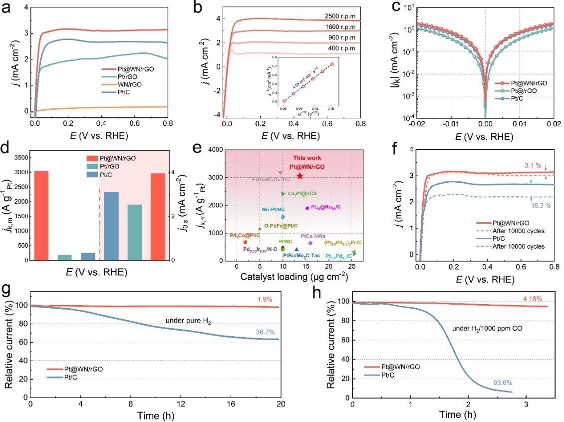 2.基于理论计算结果,设计制备的低Pt含量(1.4 wt%)Pt@WN/rGO异质结,在酸性电解液中具有优异的 HOR 催化活性和抗CO毒化能力。