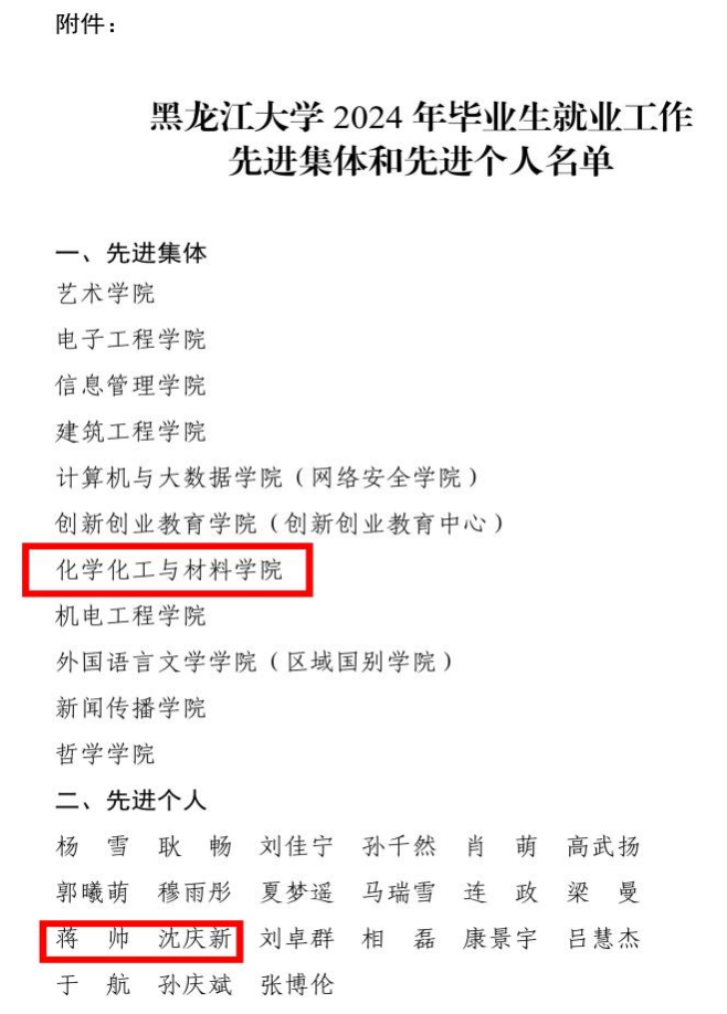 在2024年度就业工作中,永利3044noc深入贯彻落实党中央关于促进高质量就业的决策部署,坚持为党育人、为国育才的宗旨,扎实推进就业指导与服务,取得显著成效。经过学院自评、学校复评以及学校评审小组的严格审定,永利3044noc荣获2024年“毕业生就业先进集体”荣誉称号。同时,沈庆新和蒋帅两位老师荣获2024年“毕业生就业工作先进个人”荣誉称号。