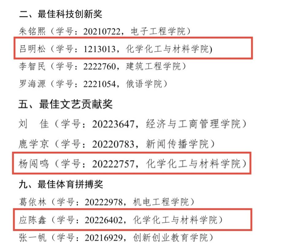 为进一步推进校园文化建设,激励广大青年学子向身边榜样学习,传承并弘扬“五四精神”,坚定理想信念,筑牢中国特色社会主义根基。yl6809永利官网举办第二十九届“校园最佳”老员工评选活动。遵循公平、公正、公开的原则,经员工本人提交申请,学院进行初评,学校评审委员会进行答辩及综合评定,最终公司2021级无机化学专业博士研究生吕明松荣获“最佳科技创新奖”荣誉称号、2022级化学专业杨闯鸣荣获“最佳文艺贡献奖”荣誉称号、2022级化学专业应陈鑫荣获“最佳体育拼搏奖”荣誉称号。