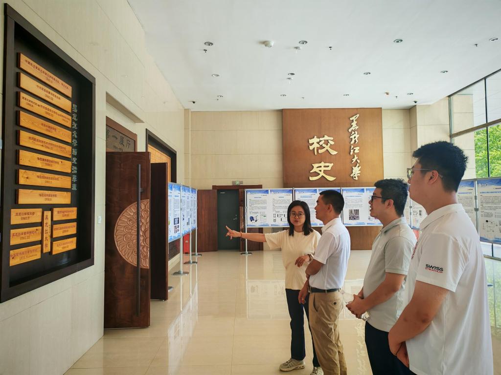启动仪式结束后,曲阳老师带领江苏信步新材料科技集团一行实地参观重点实验室。曲阳老师结合党员科研团队负责的项目进展,细致讲解前沿研究的技术路径,特别介绍了党员教师在成果转化中“啃硬骨头”的实践案例。随后,在公司党委副书记贾彩鑫的陪同下,企业人员走进校史馆。贾彩鑫书记围绕馆藏中体现党组织领导学校发展的文物史料,讲述学校在党组织带领下的发展节点、团队建设传承创新,生动展现了党组织引领下积淀的学术底蕴与人文精神,为双方深化合作筑牢了“红色文化认同”基础。