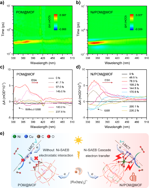 图2. Ni/POM@MOF复合材料的fs-TAS谱图及电子转移机制示意图。