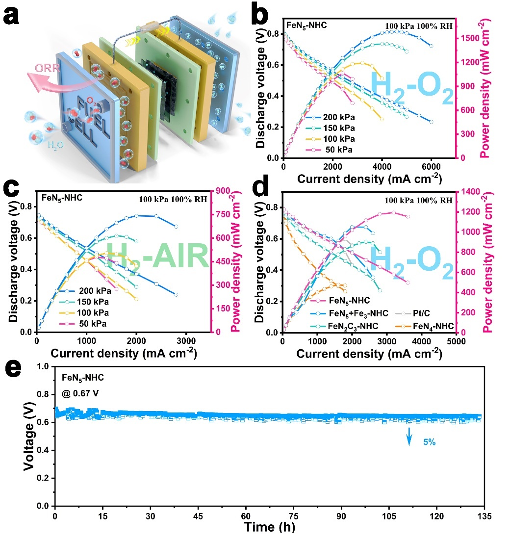 进一步评价了所合成催化剂作为阴极组装PEMFC的性能。在100 kPa H2/O2条件下FeN4-NHC、FeN2C3-NHC、FeN5+Fe3-NHC和Pt/C构建的PEMFC峰值功率密度分别为478、904、1051和938 mW cm−2低于FeN5-NHC的1194 mW cm−2。FeN5-NHC在H2/AIR条件下仍然具有较好的功率密度,且它在500 mA cm−2的操作条件下,经过135 h仅表现出5 %的电压损失。