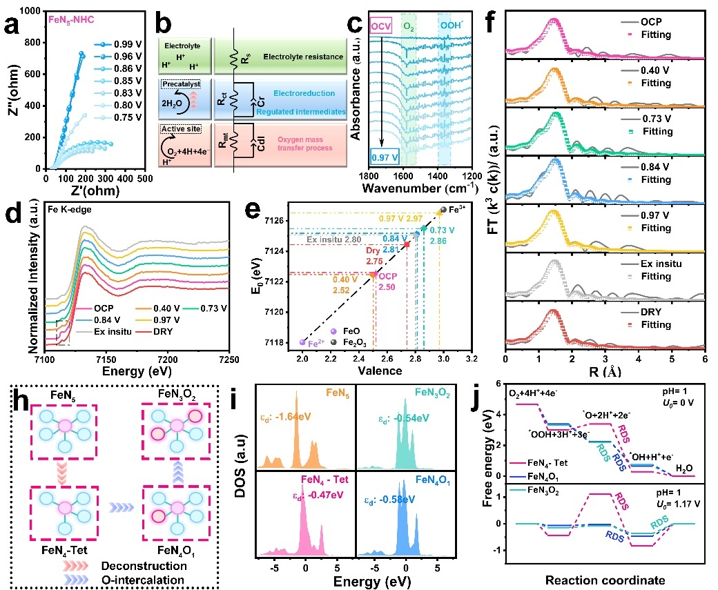 深入研究反应机理和结构演变是至关重要的。所有催化剂在较低平台电位下Rct的增加意味着高ORR反应性,导致水分子在Fe位点积聚阻碍随后的电子转移。与FeN4-NHC、FeN2C3-NHC和FeN5+Fe3-NHC相比,FeN5-NHC表现出更大的电容,这可以增加活性位点的数量和4电子反应中间体选择性(图4a-c)。反应过程中,具有优异活性的FeN5-NHC的Fe-N键发生断裂和氧的插层过程,伴随新的活性位点的引入调节了电子结构。该过程不断修复传质能力并提高催化效率,有效地保持了FeN5-NHC的活性(图 4d-g)。