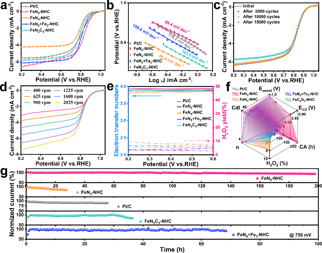 FeN5-NHC表现出最优已的酸性ORR活性,起始电位为0.98 V,半波电位为0.85 V,超过了20 wt% Pt/C的性能(图3a)。与FeN4 NHC(0.94 V,0.79 V)相比,FeN2C3 NHC(0.95 V,0.80 V)和FeN5+Fe3 NHC(0.96 V,0.81 V)显示出更高的活性,过氧化氢产率:FeN5-NHC < FeN5+Fe3-NHC < FeN2C3-NHC < FeN4-NHC。此外,FeN5-NHC在运行200 h后保持93.7 %的高电流保持率,以上结果表明轴向氮配体增强了酸性ORR催化活性。