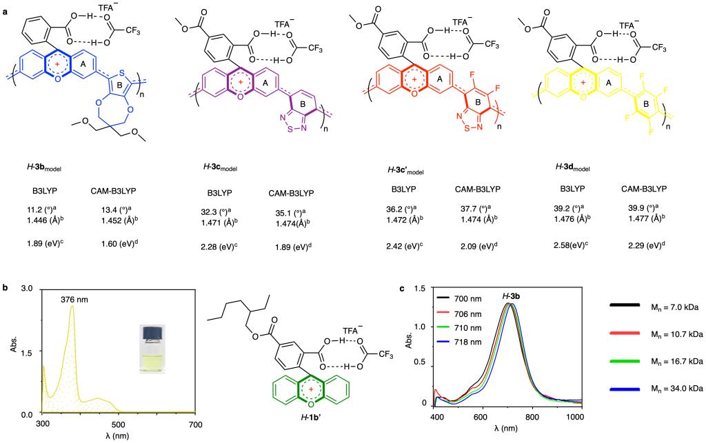我们的设计聚焦于两个关键挑战:(i)构建在外部刺激下能够实现可逆共轭切换的稳健结构框架;(ii)发展高效的调控策略。受到荧光素(fluorescein)和罗丹明(rhodamine)等pH响应型氧杂蒽类染料的启发(图1b),我们将带有内酯官能团的氧杂蒽结构单元引入聚合物主链中。在质子化条件下,分子的螺环sp³碳中心会转化为平面型的sp²碳正离子,进而在3′与6′位之间打开π共轭通道;而去质子化后,内酯结构重新闭合,共轭通道随之中断。这种可逆过程依赖于以C1为中心的碳正离子中间体,使局部共轭状态的变化得以沿整个聚合物链传播,从而实现动态调控。