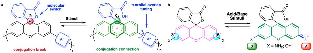 图 1. 所提出的可在外部刺激下实现共轭可逆调控的高分子结构,以及传统氧杂蒽类染料在酸碱刺激下通过调控共轭实现变色的作用机制。
