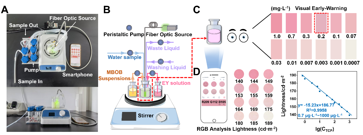 本工作通过微波辅助水热法结合原位印记策略,制备了MBOB超薄纳米片,并发展了EY-MBOB可视化光敏化传感系统,通过MBOB对CPs的Bi-Cl相互作用以及特定的分子印记识别位点的进一步提升选择吸附作用,实现了对CPs的宽检测范围内的高灵敏检测。进一步,利用该传感体系,结合自动采样、光纤光源和带有颜色识别软件的智能手机设计了实时智能传感装置,实现了真实环境水样中的CPs的有效检测,在回收率和RSD方面表现出较好的准确度,在石化公司废水的TCP检测中,检测结果与UPLC-MS/MS获得的数据基本一致,并且展现出了更高的灵敏度。本研究不仅引入了一种创新的染料半导体光敏传感策略,拓宽了其在光催化领域的应用,并为现场水质监测中超灵敏、可视化、智能检测提供了一个新的途径。