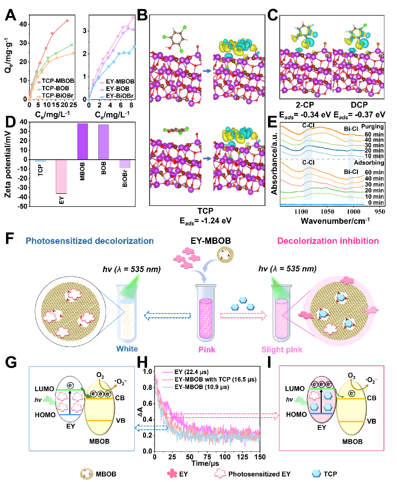 图 4. TCP选择性吸附与检测机制。(A) 在298 K下,TCP和EY在MBOB、BOB和BiOBr上的吸附等温曲线。(B) TCP分别通过垂直和平行方向接近BOB,最终获得的优化吸附结构的电荷密度差分图及相应的吸附能Eads。(C) 2-CP和DCP吸附在MBOB上的优化结构模型的电荷密度差分图及相应的吸附能Eads。(D) TCP、EY、MBOB、BOB和BiOBr的Zeta电位。(E) TCP在MBOB上吸附和吹扫过程的原位傅里叶变换红外光谱(in-situ FT-IR)。(F) 利用EY-MBOB PSS体系检测TCP的示意图。(G) EY光敏化脱色的光电子转移机制示意图。(H) 在570 nm记录的EY、EY-MBOB以及含TCP的EY-MBOB体系中三重态EY (³EY*)瞬态吸收的时间分辨衰减曲线。(I) TCP抑制光电子转移机制示意图。