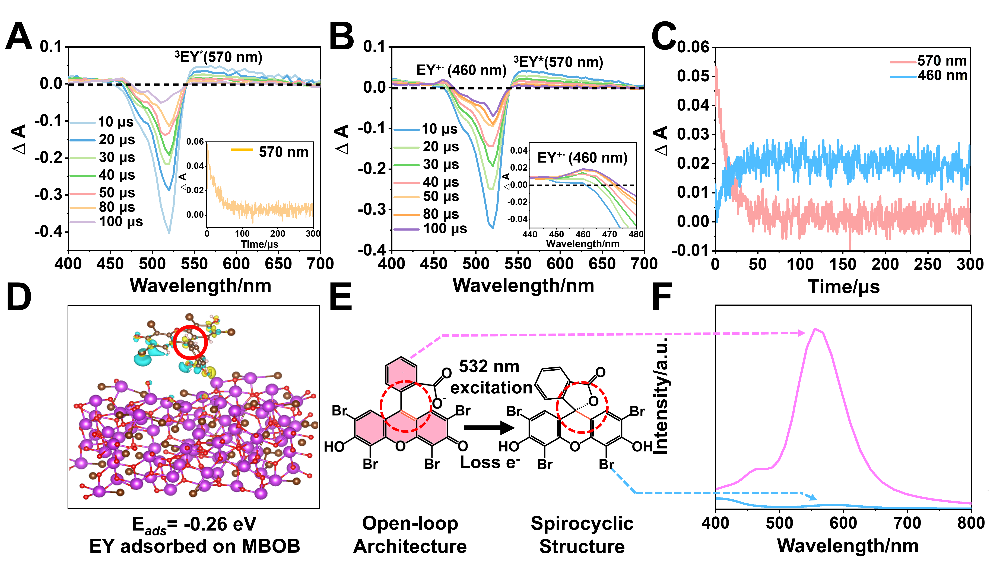 图 3. EY光敏化脱色机制。(A) 在无氧环境(N₂)下,通过激光闪光光解(激发波长532 nm)获得的EY溶液的瞬态吸收光谱。内插图:570 nm处三重态EY(³EY*)的寿命衰减曲线。(B) 在与EY溶液相同的条件下记录的EY-MBOB混合悬浮液的瞬态吸收光谱。内插图提供了460 nm处光谱位置的放大视图。(C) EY-MBOB体系中,分别在570 nm (³EY*)和460nm (EY⁺·)处对应的拟合寿命衰减曲线。(D) EY吸附在MBOB上的优化结构模型的电荷密度差分图及相应的吸附能Eads。蓝色和黄色区域分别表示电荷耗尽和电荷积累;等值面数值为 0.0005 e/Å⁻³。(E) EY光敏化电子转移前后的分子结构变化及 (F) 通过密度泛函理论(DFT)计算的相应吸收光谱。
