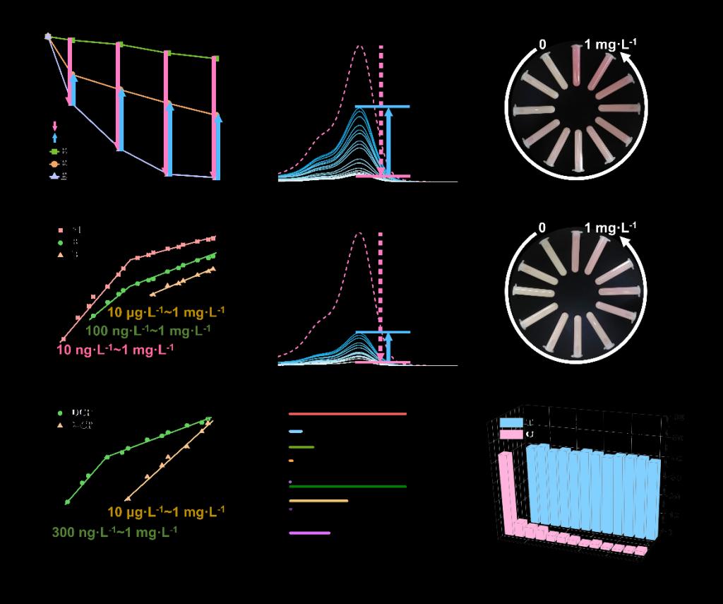 图 2. CPs的传感性能。(A) EY自氧化、MBOB光敏化(PD)诱导的EY脱色效果,以及TCP对该脱色过程的抑制作用(IPD)。(B) 在EY-MBOB PSS体系中,含有不同TCP浓度(0至1 mg·L⁻¹)的EY的可见光吸收光谱。(C) TCP对EY-MBOB PSS体系中EY脱色抑制效果的实际照片。(D) 分别利用MBOB、BOB和BiOBr时,[lg (CTCP)]与[lg (ƞI)]之间的线性拟合关系。(E) 在EY-BOB PSS体系中,TCP浓度从0增加到1 mg·L⁻1时,EY的可见光吸收光谱。(F) TCP对EY-BOB PSS体系中脱色过程抑制作用的实际照片。(G) [lg (CCPs)]与[lg (ƞI)]之间的线性拟合关系。(H) 不同传感材料检测系统的LOD和线性范围与本工作的比较。(I) 在EY-MBOB PSS体系中,TCP与其他各种有机物或无机离子干扰物存在时的ƞI比较。粉色柱状图代表TCP或每种干扰物单独存在时的ƞI,蓝色柱状图代表TCP引入每种干扰物后的ƞI。
