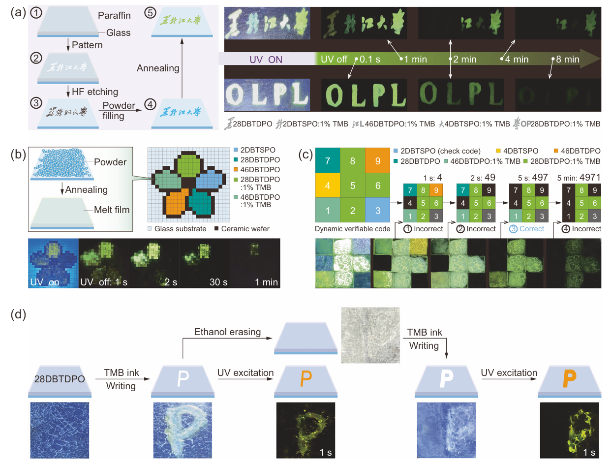 通过合理运用具有特定Tn特性(荧光寿命)的PO基质,可精准调控发光持续时间。基于纯PO熔膜与掺杂1% TMB的PO熔膜在室温下呈现不同持续时间和余辉现象,成功实现了长程多级信息显示。将28DBTDPO和PO:1% TMB材料的基底粉末填充至石蜡涂层经氢氟酸蚀刻形成的玻璃基板沟槽中,经退火处理后,熔膜分别显现出yl6809永利官网的汉字标识和“有机长余辉发光(OLPL)”英文缩写。关闭紫外灯时,所有字符均产生明亮余辉并依次消失,这与熔膜的发光寿命特征完全吻合。该工艺可进一步优化熔膜的图案化设计。通过马赛克技术便捷实现。研究人员在方形石英基底上铺展材料粉末并进行退火处理,制备出五种不同类型的马赛克砖——每种砖分别覆盖三种纯PO薄膜和两种掺杂1% TMB的PO熔体薄膜,最终形成五瓣五叶图案。由于各熔体薄膜的发光持续时间不同,激发信号移除后,这些“马赛克”砖的发光会依次消失。这种设计还使得利用熔体薄膜实现信息加密成为可能。作为验证案例,使用四种纯PO薄膜和两种掺杂1%三甲苯的PO熔体薄膜制备了六种不同类型的马赛克砖。通过九块砖组成的密码面板对应数字1至9,其中四块覆盖28DBTDPO:1%TMB薄膜,其余五块则基于其他熔体薄膜。激发信号移除后,砖块的余辉依次消失,对应时间相关的数字序列(本例中为4、49、497和4971)。基于2DBTSPO的砖块作为校验码指示正确的顺序编号。因此最终正确密码为497。纯PO薄膜与轻掺杂薄膜不同的余辉持续时间,为有效应用提供了依据。(图4)
