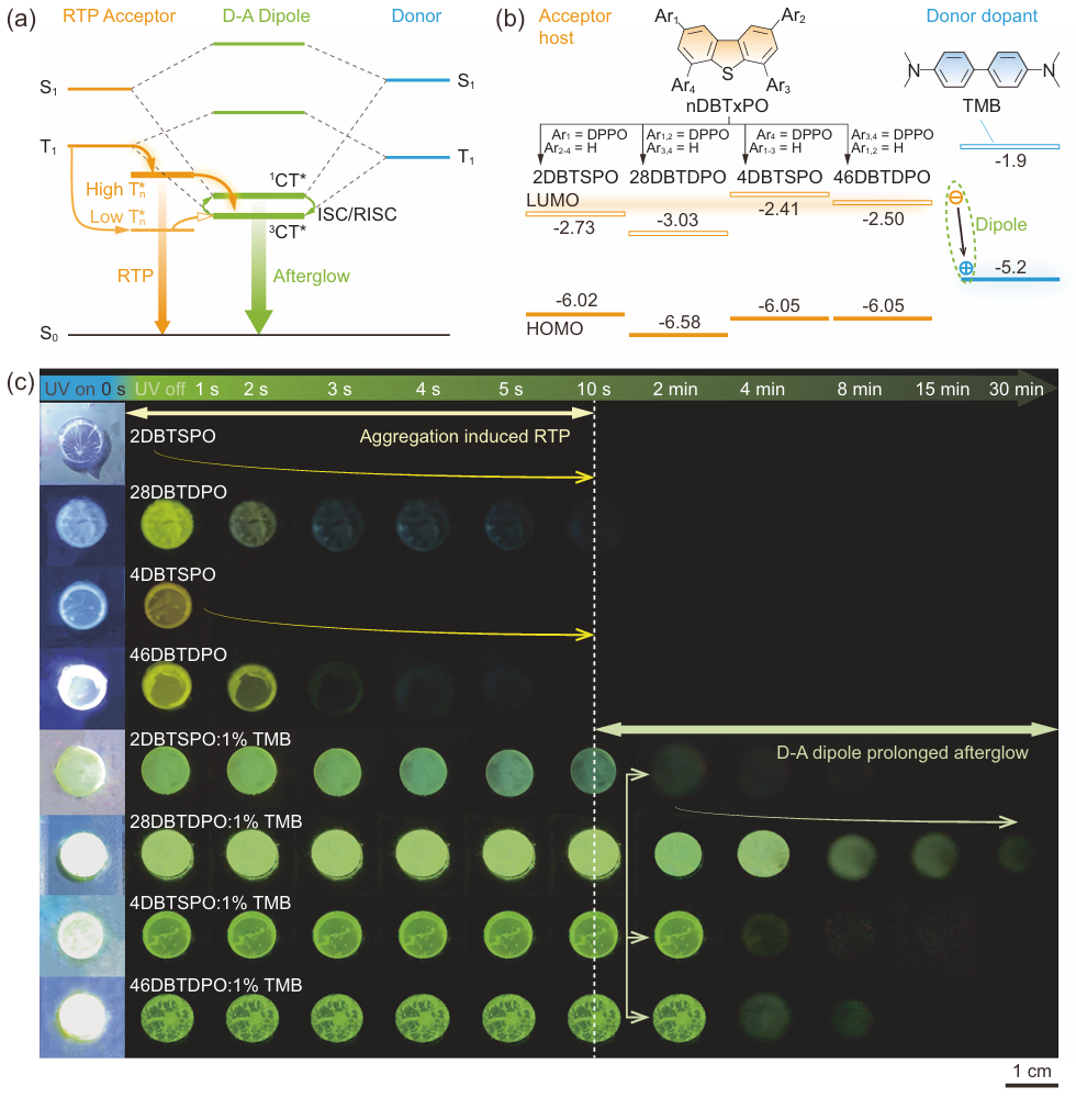 通过合理结合“能量转移”与“电荷捕获”机制,在微量掺杂供体的室温磷光受体基质中,当给体与受体的单线态和三线态能级相近时,可形成类似给体-受体激基复合物的局域偶极结构,从而实现超长余辉现象。从这个角度出发,若将局域的给体-受体偶极视为一个整体,则这类体系可称为偶极掺杂的室温磷光基质。具体而言,单分子第一三线态(T1)通过多分子稳定化的三线态(Tn *)向偶极nCT*态的能量逐步传递,最终产生超长余辉。显然,nCT*态构成了长余辉的基础,但Tn*态在激发态能量传递过程中起着关键作用,从而实现超长余辉。(图1)