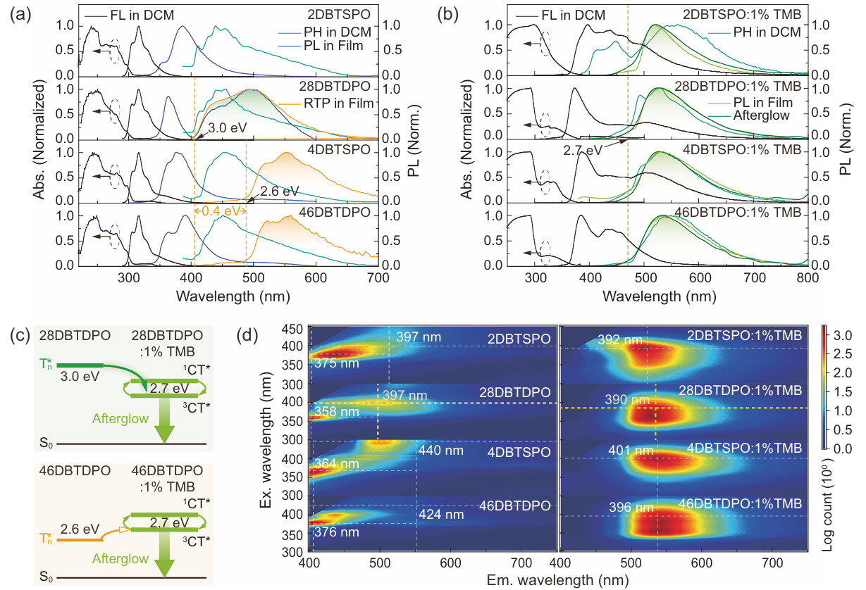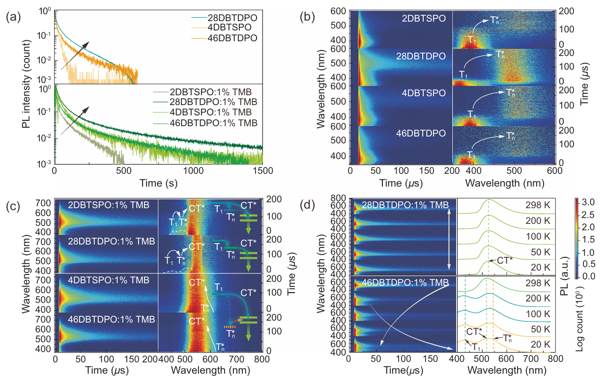 PO基质的时间分辨发射光谱证实,其室温磷光现象遵循典型的T1→Tn*能量转移机制。Tn*态的数量与室温磷光效率和寿命成正比,即28DBTDPO»46DBTDPO>4DBTSPO»2DBTSPO。在含1% TMB熔融膜的4DBTSPO/46DBTDPO体系中,Tn*态和nCT*态的特征吸收带同时出现,且后者强度显著增强。在20−298K温度下,28DBTDPO:1% TMB熔融膜的光致发光光谱仅包含nCT*态的发射带,这些发射带在激发去除后的前200微秒内保持稳定。这种温度无关特性以及低温下纯28DBTDPO熔融膜中T1和Tn*态的缺失,与室温磷光基质向偶极子传递正向吸热能量的现象相吻合。然而对于46DBTDPO:1% TMB熔融膜,其基质的Tn*态在室温下的磷光带始终能在前200微秒内被清晰区分,且其强度与温度呈反比关系。在20−200 K温度下,46DBTDPO-TMB偶极发射带的发光强度始终与Tn*→nCT*上转换的放热特性相匹配。因此,对于给体-受体余辉系统而言,两个长寿命激发态的能量传递将有利于提高长持续发光的效率和持续时间,前提是基质具有稳定的激发态和前沿分子轨道能级,并且激发态与掺杂剂相匹配。(图3)
