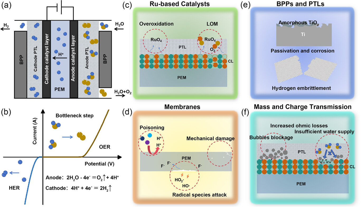 钌基质子交换膜水电解系统的稳定性问题本质不仅是催化剂的衰减,而是全体系的连锁反应。膜的化学降解、多孔传输层与双极板的腐蚀、由质量传输和电荷转移限制引发的膜脱水及催化剂层剥离,以及这些退化过程间的相互影响都会显著影响系统的整体运行稳定性。(图1)