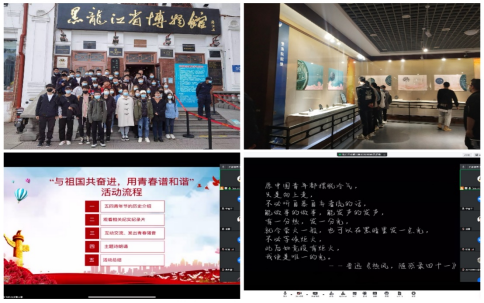 此次团日活动中,各团支部组织的活动形式多样,参加线上及线下活动的同学们以了解五四运动的历史、观看相关纪实纪录片、欣赏五四主题诗朗诵等形式开展,旨在引领同学们学习五四时期爱国青年们不畏强权、不惧牺牲的优秀爱国精神,使同学们对自身肩负的责任感和使命感有更深刻的认识。以线下活动参观为主的同学们则参观了黑龙江省博物馆,在博物馆浓厚的历史氛围中进一步了解了五四运动的前因后果,进行爱国主义教育宣传、丰富同学们精神世界的同时,也进行了一次形式丰富的党史学习教育。最后,同学们主动分享了本次活动的见闻,在各团支部中展开了关于五四青年的激烈讨论,并呼吁青年同志学习他们热爱祖国、积极创新的精神,担当起中华民族伟大复兴的时代重任。