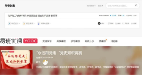竞赛期间,学院团委及易班工作站通过优课及问卷星等多样的学习形式,发布相关的知识点与练习题,供全院师生学习与探讨。其中,公司各教师充分发挥先锋模范作用,以身作则,用实际行动带领员工树立正确党史观,做到对工作及员工高度负责,练就会学党史、会讲党史、会用党史的真本领、硬功夫,把高标准、高质量完成党史学习教育任务作为一项政治要求。