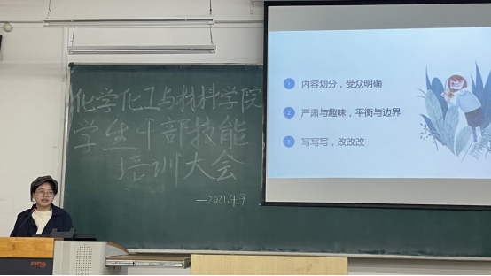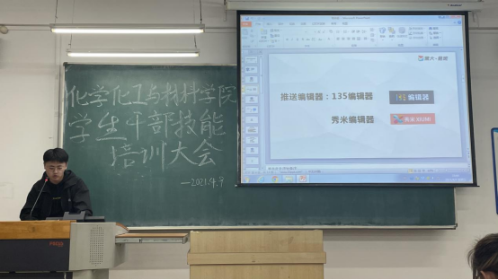 紧接着,上届团委宣传部副部长兼易班工作站站长魏双为大家讲解公众号排版的相关知识。他从自己的工作经验出发,并结合实例,为大家详细讲解了有关排版、发推送、标题设计、ps教学基础、剪辑视频等。同时对比了不同素材网站、软件的优缺点。随后就易班工作内容对员工干部们进行了讲解。最后,他鼓励大家多实践,多思考,不断学习,提升自己的能力,并且祝愿员工干部们从心出发,我们一直在路上。