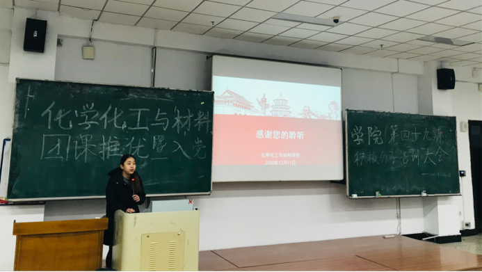 随后,刘京强老师提出,向党组织提交入党申请书前,一定要端正自己的入党动机,要思考自己为什么要入党、入党后想要为党组织做些什么以及能够为党组织留下什么。同时,刘京强老师也提到了化学院学子的品格与使命担当,他希望同学们能做到勤奋好学、艰苦朴素,坚定信仰、勇挑重担,明确自身发展方向,不断提升政治素养,努力将自己培养成一名优秀的社会主义建设者和接班人。会议最后,刘泽亿老师表达了对在座同学们的期望,希望同学们要努力学习党的理论知识,根据时代明确自身的使命和信念,提高自身站位、加强格局意识,用化学知识为国家各项事业做出贡献,鼓励同学们早日通过自身努力加入中国共产党。