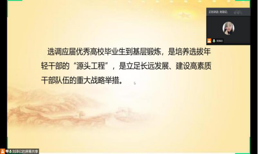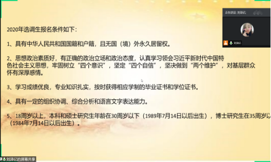 会议开始,刘京强老师指出大家应积极了解并向身边同学宣传和普及选调生相关政策,根据考试时间的要求及个人情况在公务员和选调生中做出合理选择,并鼓励符合要求的同学们积极报考。接下来,刘泽亿老师详细解读了关于2020年黑龙江省选调生相关政策文件,并针对选调生报考条件、申请流程、注意事项进行了全面讲解。