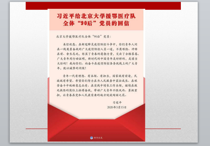 此次团日活动各团支部以丰富且有意义的活动形式,通过歌唱《共青团之歌》、手语操、观看战疫系列纪录片、诗朗诵等形式开展,旨在引导同学们学习奋战在一线的医务工作者、军人和志愿者们的奉献精神与榜样力量,使同学们对自身肩负的责任感和使命感有更深刻的认识。在各团支部的团日活动展演中,2019级应用化学专业同学们的手语操“不放弃”的表演,坚定的手势背后,是化院学子们满腔的爱国之心和无比团结的力量,是我们青年一代对战胜疫情、共克时艰的责任与担当!多个团支部在活动中组织同学们观看战疫纪录片,大家内心又一次被无私奉献的医护人员所震撼,感动于奋战在一线的各行业人员的辛勤付出。团支书们为大家展示雷神山、火神山医院的图片,使同学们在领略中国速度的同时,对背后强大的中国精神、中国力量有了更加深刻的认识。此外,一些团支部组织同学们学习习近平总书记在统筹推进新冠肺炎疫情防控和经济社会发展工作部署会议的重要讲话,研读习近平总书记给北京大学援鄂医疗队全体“90后”党员的回信,同学们备受鼓舞并踊跃发言展开激烈讨论。最后,同学们主动分享了在疫情期间的所闻所感,纷纷向疫情防控阻击战中的“最美逆行者”致敬,并学习他们不惧艰难,勇担重担的精神,担当起中华民族伟大复兴的时代重任。