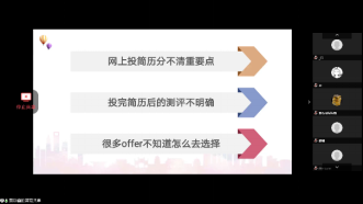 活动伊始,刘京强老师结合疫情影响下各领域的招聘需求变化帮助同学们了解就业形势的严峻性,并分析了近期在求职择业中出现的问题,希望大家坚定就业自信心,认真学习分享会相关内容。随后,贾彩鑫老师从网投简历重点、职业测评、offer选择三个方面展开讲授。她表示,毕业生应该先明确职业定位,让职业规划走在前面。在投递简历时优先考虑岗位与性格、价值观的匹配性,抓住企业需求重点,突出个人优势。贾老师还介绍了不同测评方式的特点及应答方式,并建议同学们通过决策平衡单来实现自我剖析,进行offer的选择。最后贾彩鑫老师对同学们提出的合同签订等问题进行了详细的解答。