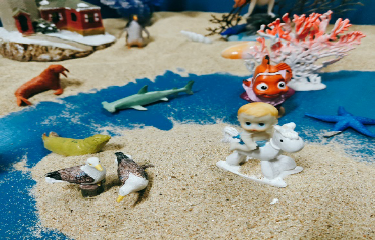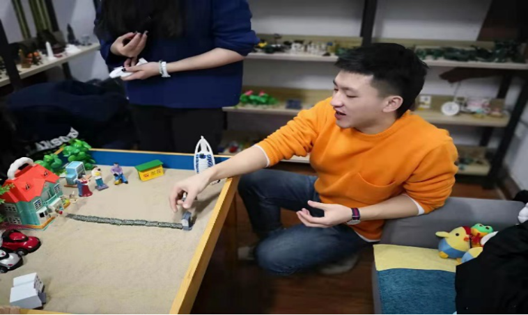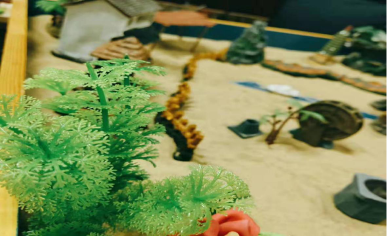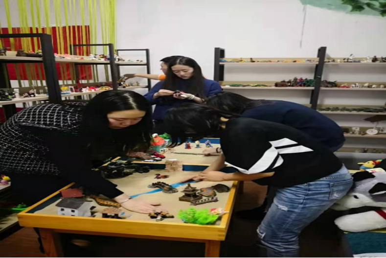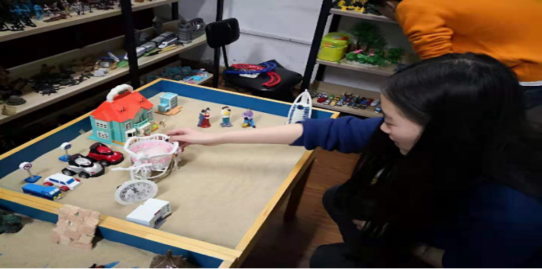 沙盘游戏,亦称箱庭疗法,是在治疗师的陪伴下,让来访者从摆放各种微缩模具的架子上,自由挑选小模具,摆放在盛有细沙的特制的容器中,创造出一些场景。在沙盘体验中,如果要完成一个生动的场景,不仅需要成员们拥有丰富的想象力,还需要每位小组成员互相配合。在过程中,团队分工逐渐明确。随着作品的不断完善,成员们的思维变得更加活跃,画面也变得更加丰富多彩。