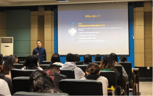 本次招聘宣讲会分为企业宣讲,互动问答,递交简历三个环节。招聘宣讲会开始前,招聘人员对同学的专业、年级以及求职意向等进行了简单的了解。招聘宣讲会开始后,药物开发国际部主任许州结合PPT,介绍了公司的主要部门及项目的推进流程,同时详细说明了公司的发展历程、业务发展平台、产品研发等企业相关信息。