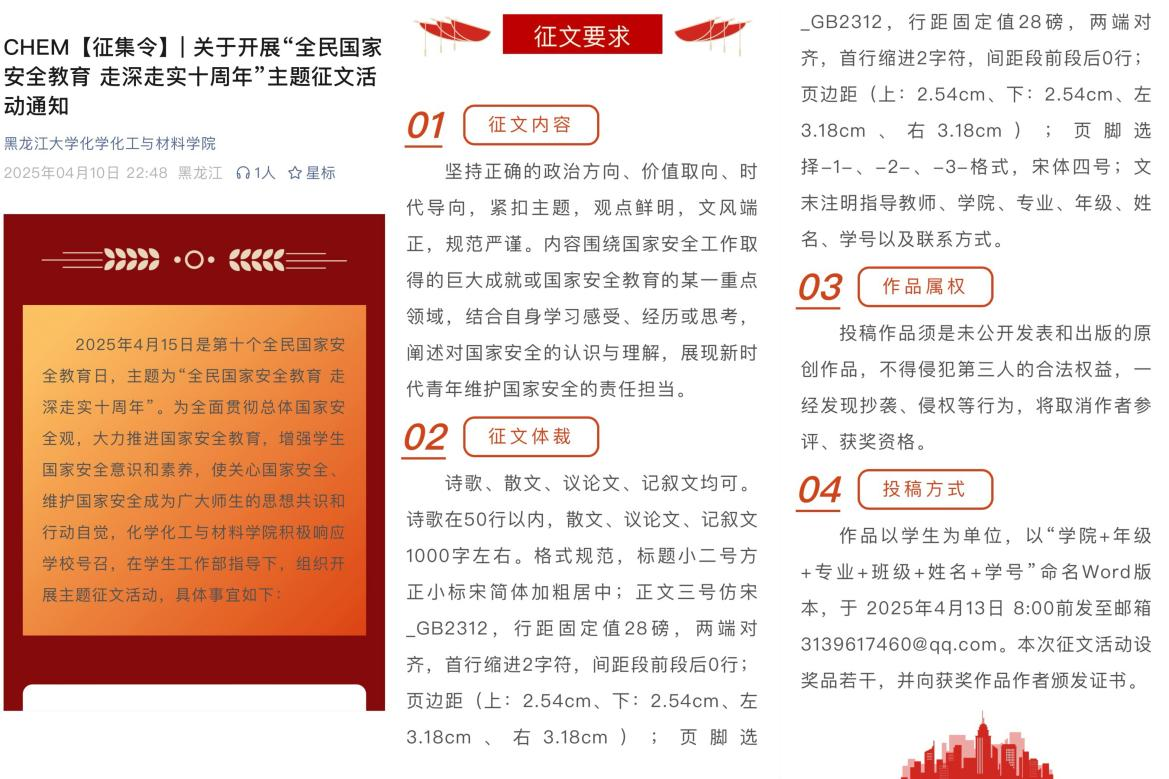为深入贯彻落实总体国家安全观,进一步筑牢青年学子维护国家安全的思想根基。永利3044noc以第十个全民国家安全教育日为契机,积极响应学校号召,紧扣“全民国家安全教育,走深走实十周年”主题,立足学科特色与育人职能,多样化开展国家安全教育工作,扎实推动国家安全教育宣传工作提质增效。