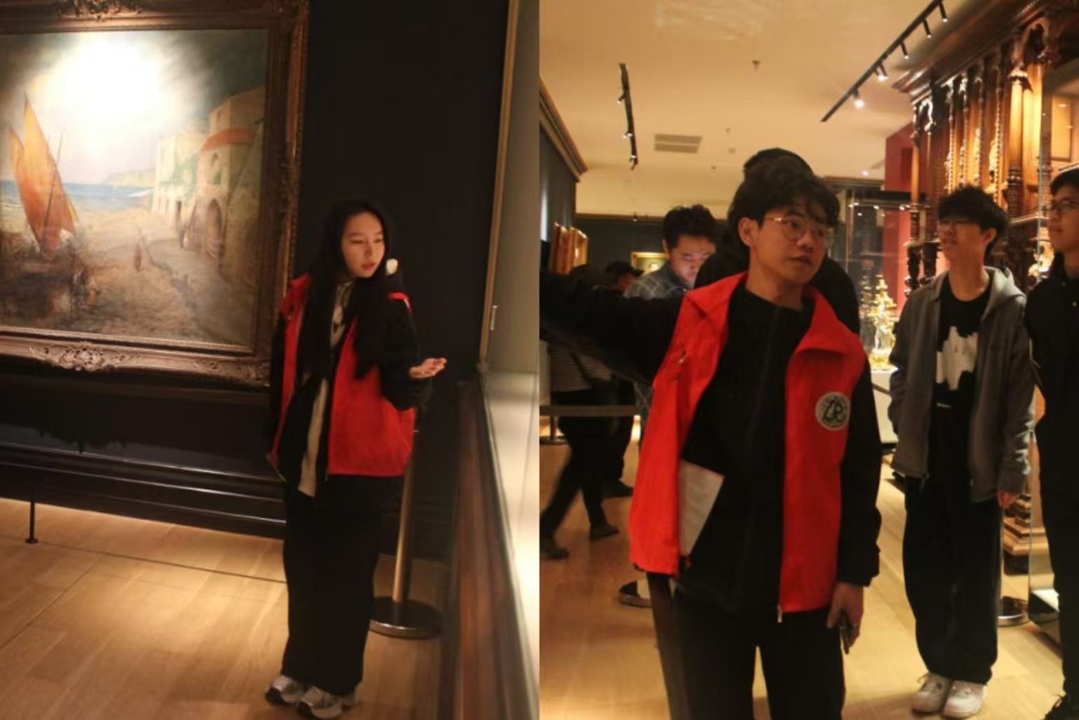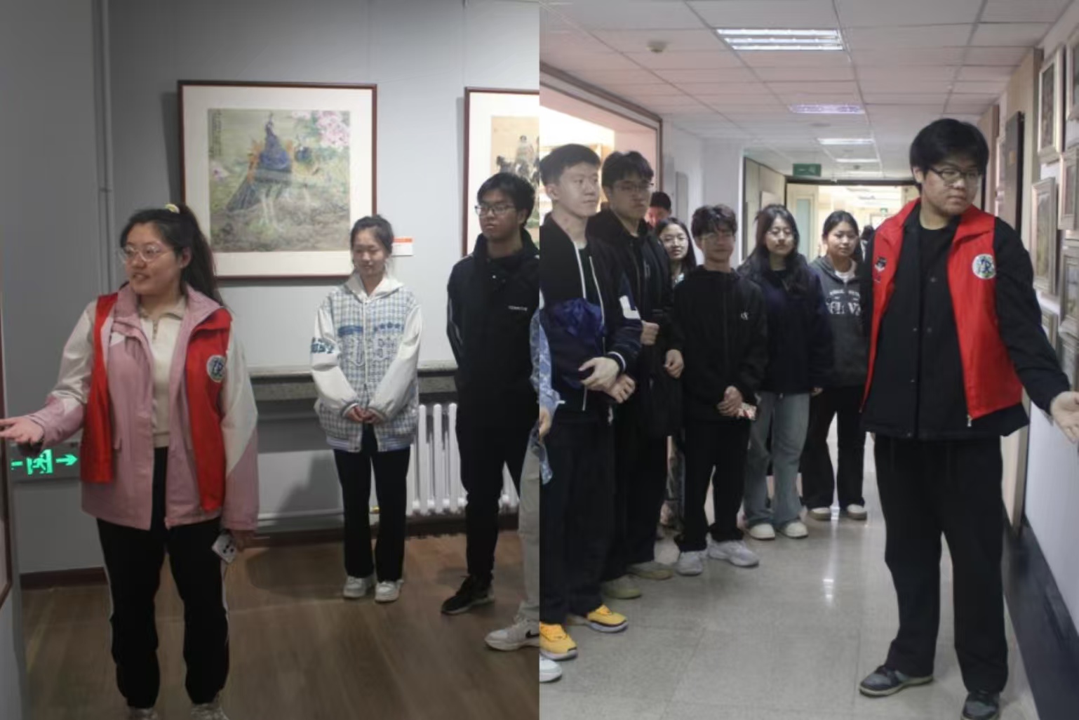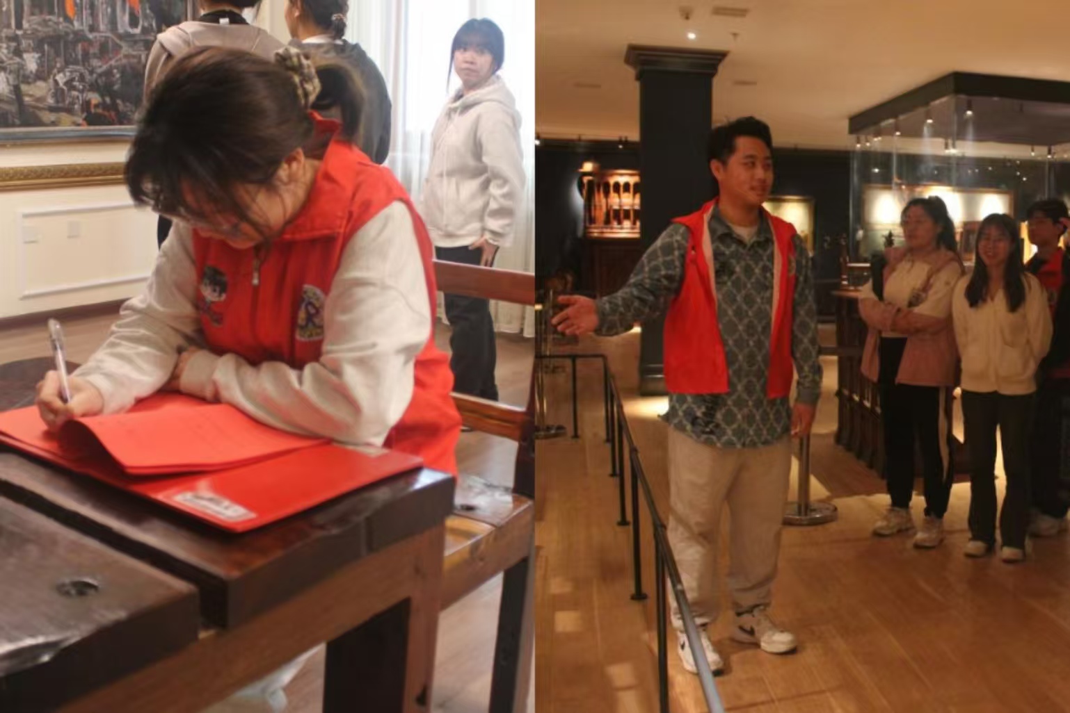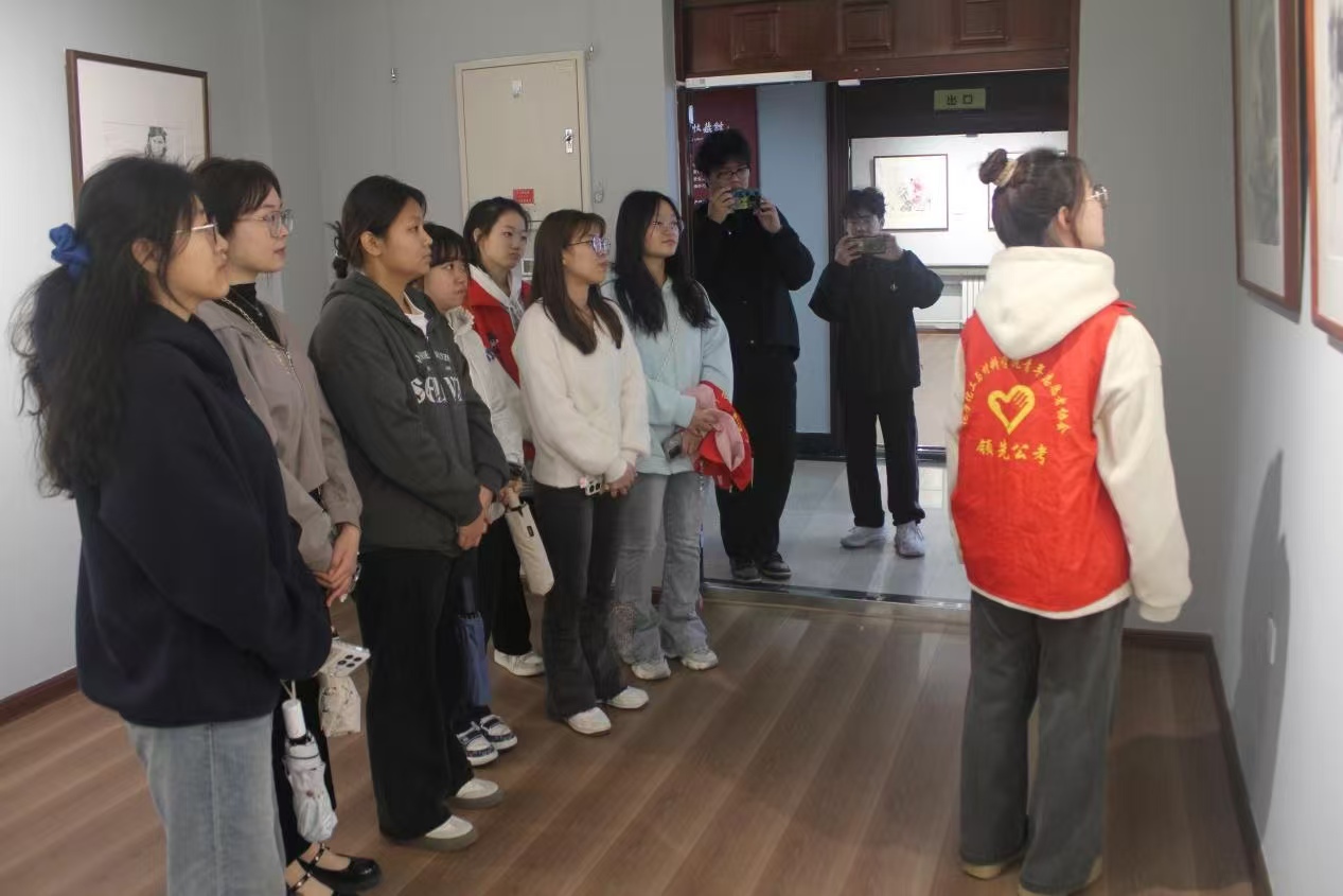 讲解前,志愿者讲解员石爽、张洵睿、王诗宇便积极筹备。她们精心撰写讲解词,对数据史实反复核对,逐字打磨内容,确保讲解精准无误。同时深入钻研文物细节,对生僻字词、专业术语仔细查证。讲解当日,三位志愿者早早来到展厅,在展区间反复演练,熟悉每件展品的陈列位置与展厅布局,同时不断调整讲解节奏、锤炼语调,只为呈现最专业流畅的讲解效果。