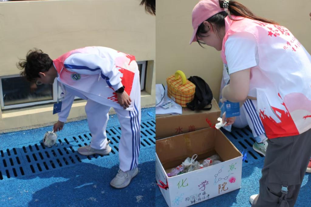 运动会过程中,志愿者们早早到达各自岗位,检录引导组的志愿者耐心地为运动员讲解比赛规则和注意事项,引导他们有序检录、前往赛场。志愿者们还准备垃圾桶并在上面进行涂鸦设计,让大家感受到志愿者的热情与亲切。此外,志愿者们还主动承担起为观众服务的工作。他们引导观众有序就座,解答观众的各种疑问,帮助维持看台秩序,让观众们能够安心、舒适地观赛。
